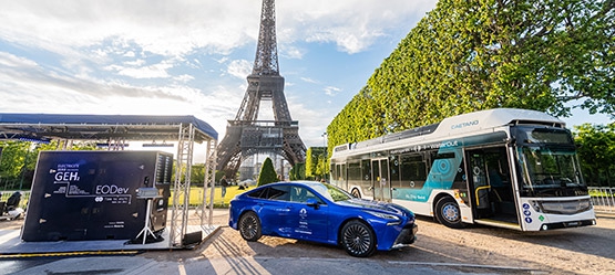 De groen verlichte Eiffeltoren maakt deel uit van het evenement ‘Paris de l’hydrogène’, het parkgebied dat wordt begrensd door de Eiffeltoren. De gebruikte GEH2-generator voedt het Energy Observer-dorp dat tijdens het duurzame event aan de voet van de Eiffeltoren te vinden is. Veel ondernemingen met energie- en mobiliteitsoplossingen waarbij waterstof een rol speelt, presenteren hier hun voertuigen en toepassingen waarmee ze een duurzaam en innovatief perspectief op de steden van morgen demonstreren. De technologie van Toyota speelt een belangrijke rol op het evenement